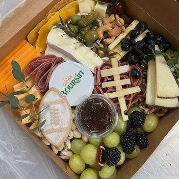 Our boxes are a curated box with assorted cheeses & meats. Fresh and dried fruits, nuts and jam. Premade prior to your preorder pick up. Need multiple? Text to reserve.